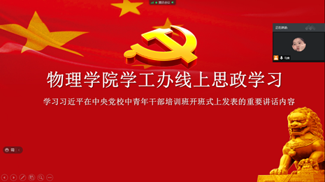 10月15日下午,马爽同学为物理学院学工办成员线上分享了关于习近平在中央党校中青年干部培训班开班式上发表的重要讲话内容,在学工办成员中引起了热烈反响。