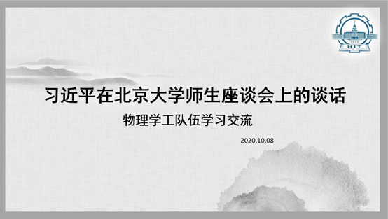 10月8日下午,物理学院学工办举行线上分享习近平总书记在北京大学师生座谈会上重要讲话的学习分享,会议由物理学院研究生会副主席闫茵茵主讲,学院党委副书记赵异肖、学院团委书记兼本科生辅导员宗剑老师、研究生辅导员秦必达老师以及学生兼职辅导员全体线上参与学习。