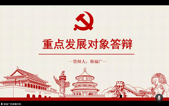 答辩开始前,张丽玫老师向与会老师及党支书简单介绍了参加此次答辩的重点发展对象信息及答辩顺序,并介绍本次答辩规则:每位同学有三分钟的PPT展示时间,结束展示后答辩同学需接受老师和党支书的提问。随后,答辩开始,17位重点发展对象分别从对党的认识、入党动机、先锋模范带头作用和社会实践等几个方面进行答辩,老师和各党支部书记就答辩内容进行针对性提问。所有同学答辩结束后,赵老师肯定了同学们表现的同时,也指出了存在的不足,例如对理论知识的认识薄弱,对时间的掌控不到位等;最后强调,希望大家继续将习近平总书记贺信精神和学校十三次党代会精神作为2021年度学习工作的重点,发挥好党支部战斗堡垒作用,不断强化政治引领,争取早日加入党组织。随后,与会老师、党支部书记结合答辩情况进行表决,同意推荐17位同学成为重点发展对象。
