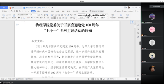 3月19日晚,物理学院于线上召开2021年3月份学生党支部书记工作例会,党委副书记赵异肖、兼职辅导员张丽玫及全体学生党支部书记参加会议,会议由兼职辅导员张丽玫主持。