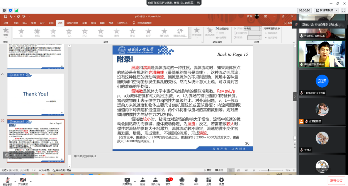 本次校内赛于5月1日上午8点在腾讯会议举行线上开幕式。物理学院执行院长田浩、副院长张宇、党委副书记赵异肖参加开幕式并分别讲话,介绍了举办比赛的初衷,表达了对参赛队伍的鼓励,并深切期望参赛的同学能够在备赛和比赛的过程中有所收获。各支队伍依次进行队伍介绍和风采展示,各支队伍都通过口号表达出了自己的精神面貌。开幕式由2019级国赛队员黄昕诺主持。