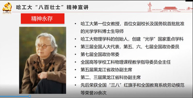 我校“八百壮士”精神宣讲团成员、洪晶先生事迹宣讲人王健副教授首先介绍了先生生平,详细列举了先生作为哈工大第一位女教授、首位女副校长及国务院首批批准的光学学科博士生导师,作为哈工大物理学科的创始人、光学国家重点学科的建设者、我国著名的女物理学家和教育家在不同历史时期做出的卓越贡献。王健表示,洪晶先生作为老一代“八百壮士”杰出代表,心系祖国,甘于奉献,治学严谨,追求卓越的精神,是值得每一名哈工大人、哈工大物理人永远铭记的宝贵财富!
