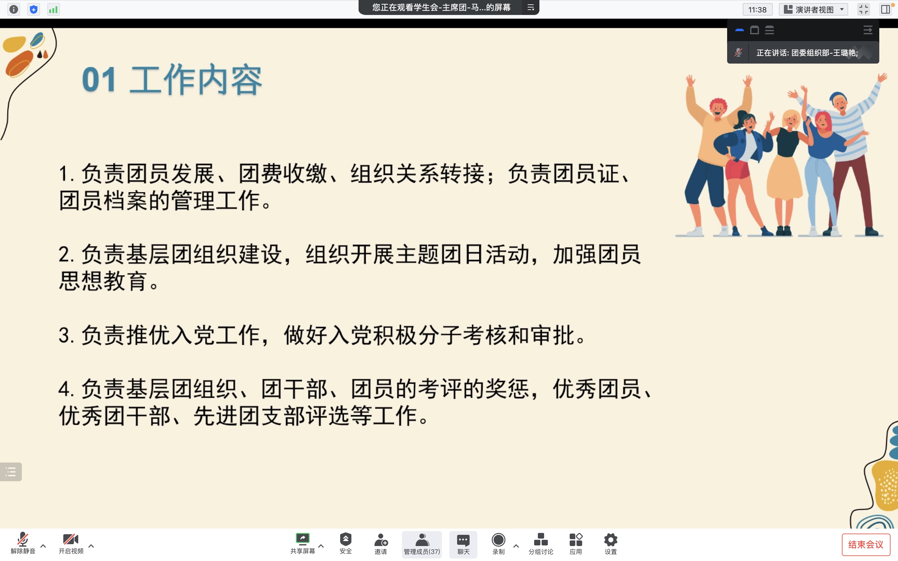 随后,物理学院学生会主席团成员马泽文及各部门负责人为大家重点介绍了学生会的组成架构、具体职责分工等。学生会是学院本科生自我管理服务的重要机构,是学生活动的主要组织者,是团委与同学之间的沟通桥梁。几位同学的介绍引人入胜,学生会的优良传统将在一代代学生中得到传承与发展。