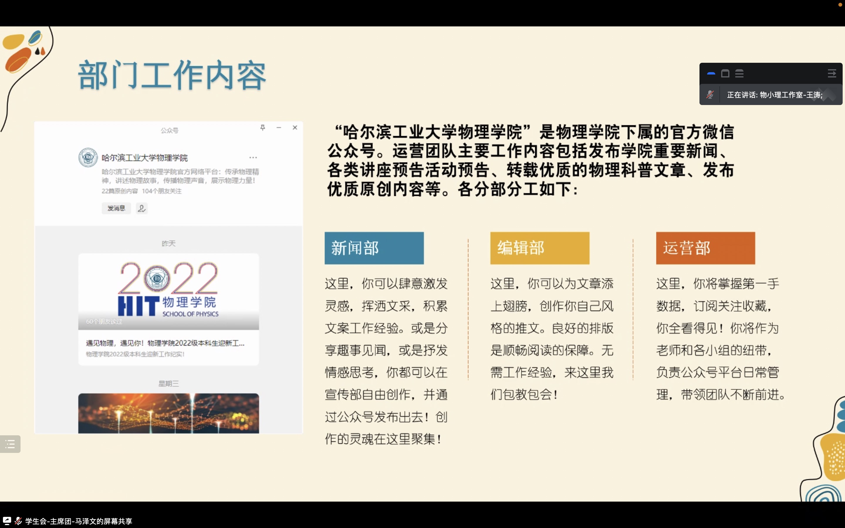 接下来,学院的新媒体运营团队——物小理工作室负责人王涛同学给大家介绍了有关新媒体平台运营的工作内容,他的宣讲从物小理的发展壮大流程开始,为同学们介绍了学院新媒体平台的一步步建设,他强调了新媒体运营团队的独立性与特殊性,邀请有志于从事平台运营的同学加入物小理工作室。