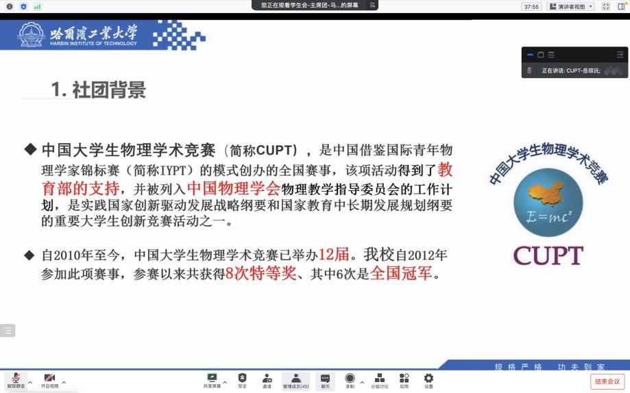 最后,大学生物理学术竞赛社的骨干成员岳琮沅为大家介绍了有关CUPT竞赛及社团的相关事宜,为大家展示了物理学院一代代本科生在学术竞赛方面的光荣历史及优良传承。CUPT社团是学院科创竞赛方面的核心队伍,承担了学院本科生参加学术竞赛各方面的服务工作。