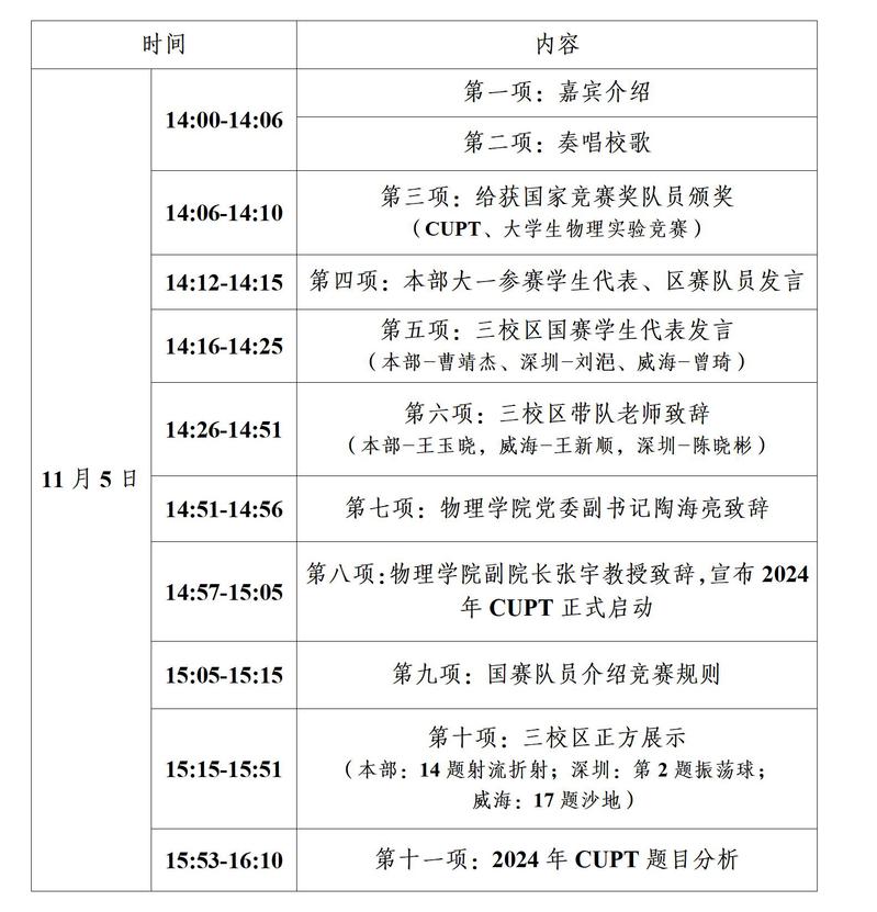 为表彰第十四届中国大学生物理学术竞赛哈尔滨工业大学、哈尔滨工业大学(深圳)、哈尔滨工业大学(威海)代表队、大学生物理实验竞赛各队伍取得的成绩,启动第十三届哈尔滨工业大学大学生物理学术竞赛校赛,宣传大学生物理学术竞赛,特举办2023年CUPT哈工大一校三区表彰大会暨2024年大学生物理学术竞赛校赛启动仪式。大会通知如下: