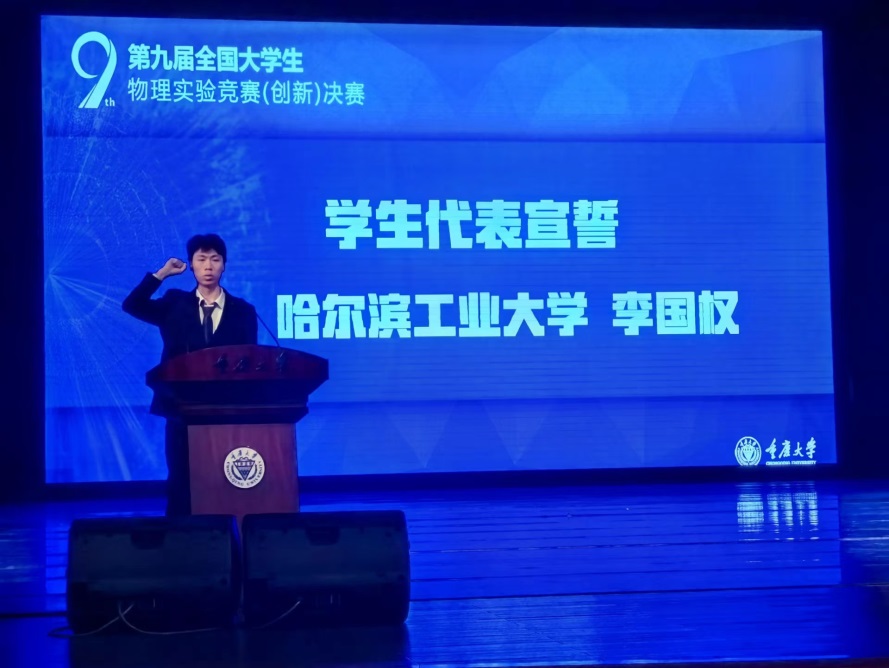近日,由国家级实验教学示范中心联席会物理学科组、全国高等学校实验物理教学研究会、教育部大学物理课程教学指导委员会大学物理实验专项委员会和中国物理学会物理教学委员会主办,重庆大学承办,《物理实验》杂志协办的第九届全国大学生物理实验竞赛(创新)在重庆大学虎溪校区举行。物理学院组织并指导5支队伍满额参赛,获得一等奖4项、三等奖1项,哈尔滨工业大学代表队获得优秀组织奖,未来技术学院李国权同学在比赛开幕式上代表全国参赛学生宣誓。