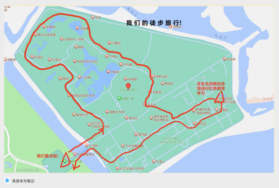 当天下午13点半,同学们齐聚理学楼前,一同出发前往徒步锻炼地点——太阳岛。本次徒步路线为绕太阳岛景区徒步,全程用时近2个小时。同学们在徒步中展现了强健的身体素质,不怕苦、不怕累,没有一个同学掉队。徒步过程中,同学们还在东北抗联纪念园进行了红色教育主题学习,在缅怀先烈的同时进一步坚定了保家卫国的志气。
