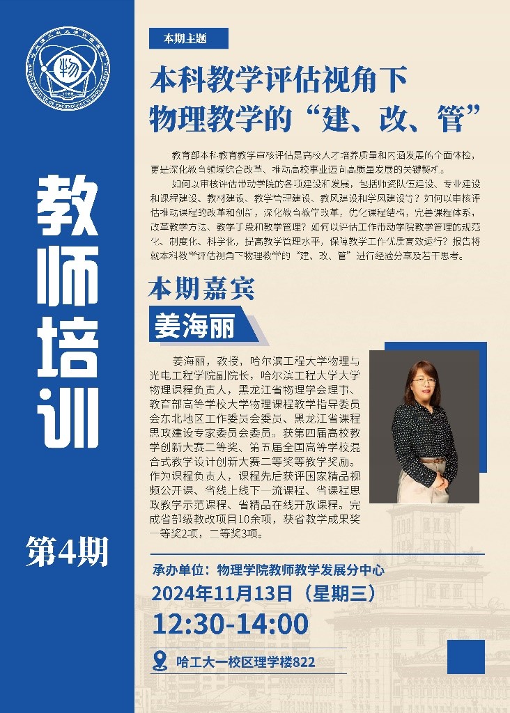 物理学院教师发展分中心于202411131230在理学楼822举办了教师培训讲座。本次讲座由周可雅教授主持,特邀哈尔滨工程大学姜海丽教授,做了题名为“本科教学评估视角下物理教学的“建、改、管””的报告。